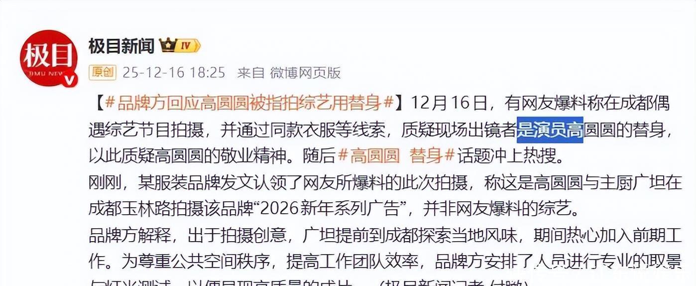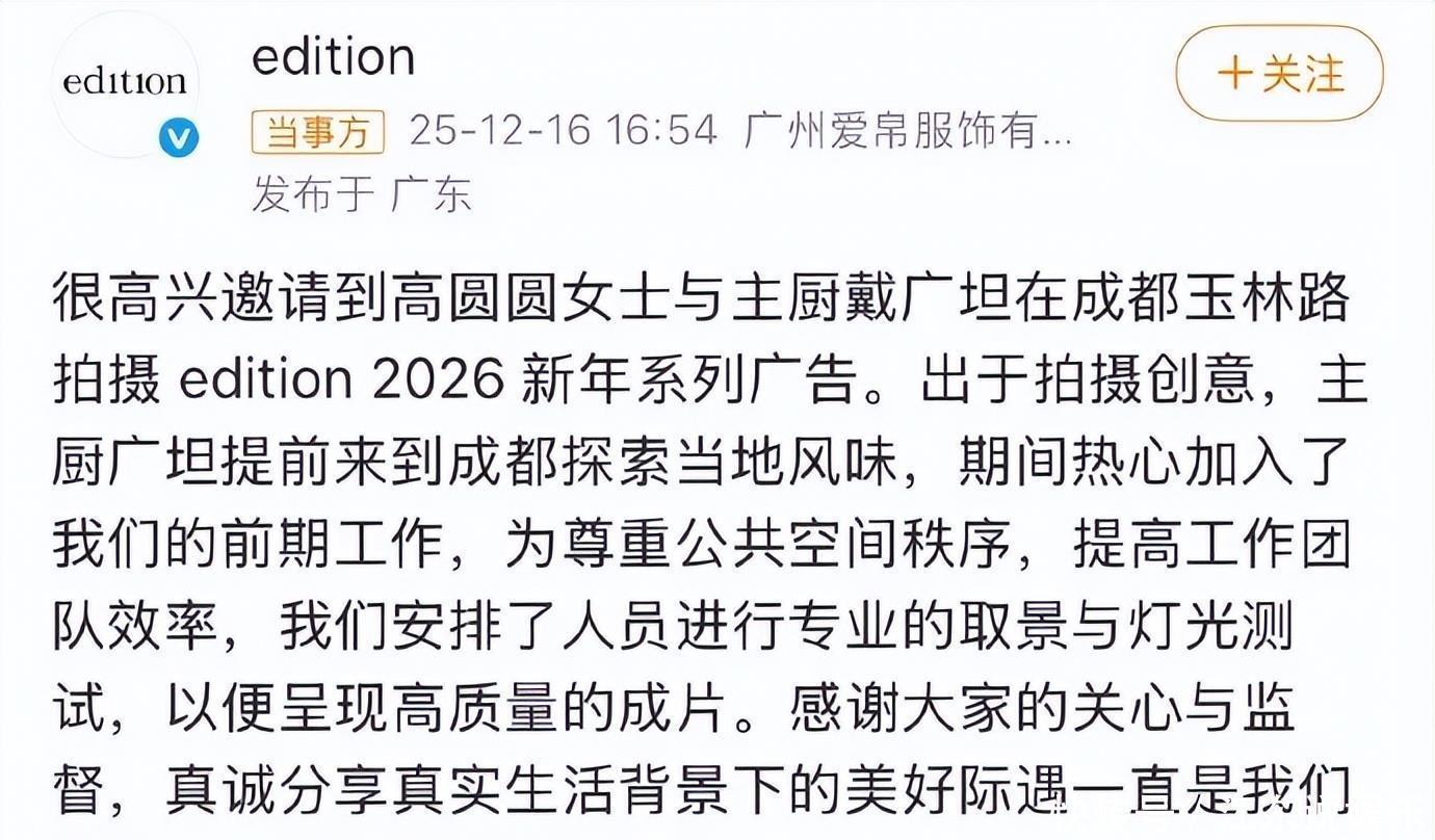 随着话题#高圆圆 替身#冲上热搜,事件在12月16日迎来关键转折。某服装品牌官方发文,正式认领了此次拍摄。品牌方澄清,这并非网友所猜测的综艺节目,而是高圆圆与法国主厨戴广坦(广坦)合作拍摄的该品牌“2026新年系列广告片”,旨在呈现成都玉林路充满烟火气的市井生活场景。